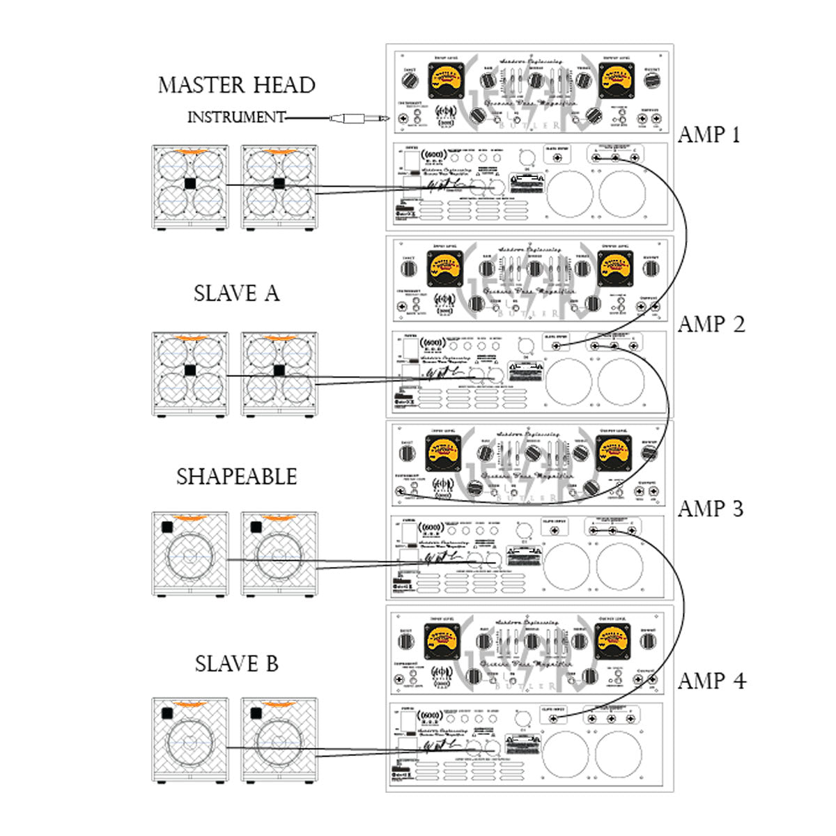 Es können mehrere Boxen und Slave-Amps betrieben werden