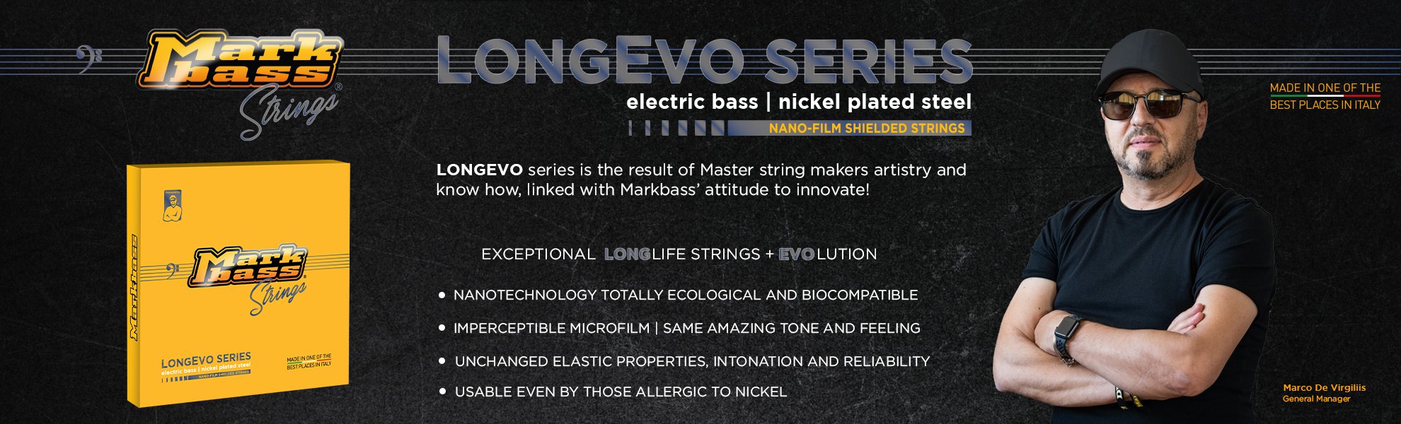 Die LONGEVO-Serie ist das Ergebnis dieses Zusammentreffens: Meisterhafte Kunstfertigkeit und Know-how, verbunden mit der Innovationshaltung von Markbass. Markbass respektiert die Umwelt als grüne Marke und verwendet Nanotechnologie, die völlig ökologisch und biokompatibel ist! Dabei bleiben die elastischen Eigenschaften, Intonation sowie Zuverlässigkeit unverändert!
